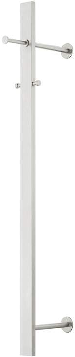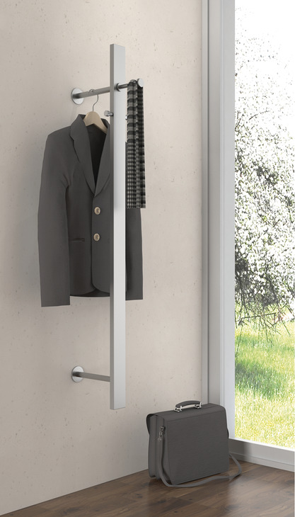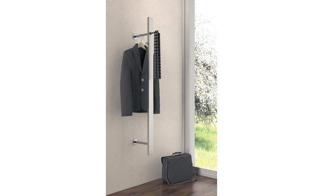 Гардеробная вешалка держатель для одежды, с двумя фиксированными крючками и выдвижной телескопической панелью. Вешалка изготовлена из нержавеющей стали класса качества 1.4305, с матовой поверхностью, монтируется с помощью прикручивания шурупами к стене.
