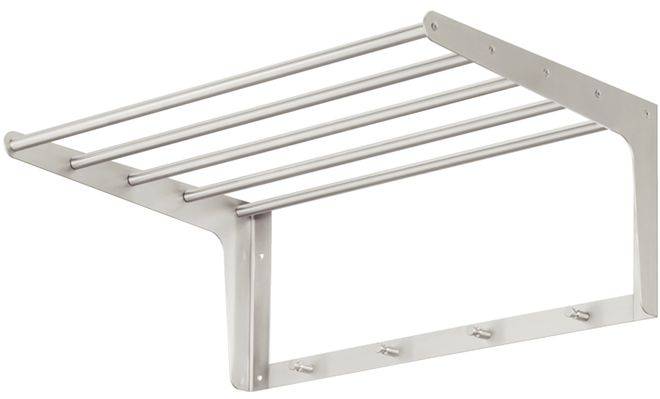 Гардеробная вешалка держатель длиной 600 мм с четырьмя крючками, для настенного монтажа, изготовлена из нержавеющей стали класса качества 1.4301, с матовой поверхностью. Размеры вешалки, ширина / глубина / высота - 600/400/250 мм.