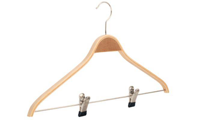 Вешалка для одежды с поворотным крючком, и зажимами. Вешалка изготовлена из букового дерева с лакированной поверхностью, крючок изготовлен из никелированной стали. Ширина вешалки 450 м.
