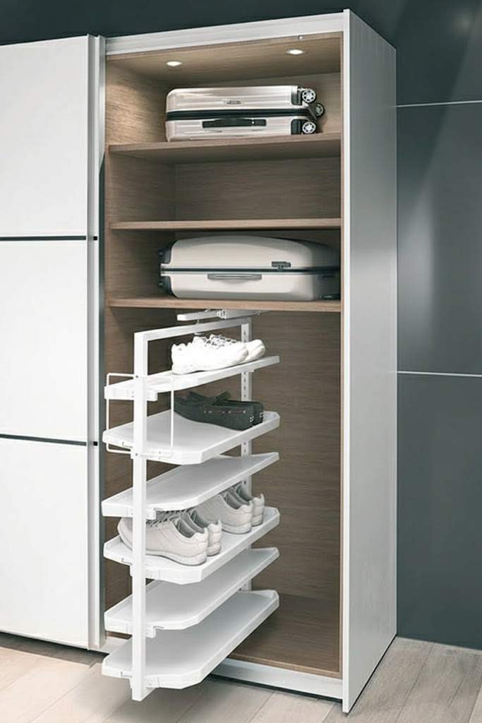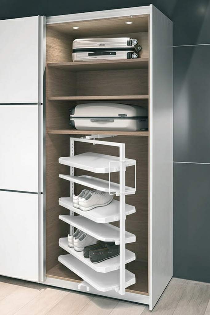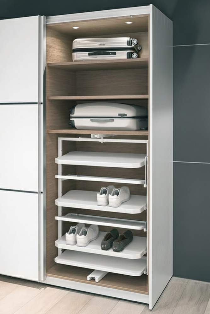 Компактный выдвижной поворотный шкаф для обуви позволяет удобно хранить до 20 пар обуви (макс. длина 310 мм). Модуль вращается на 180° для доступа с обеих сторон, а полки легко снимаются для уборки.