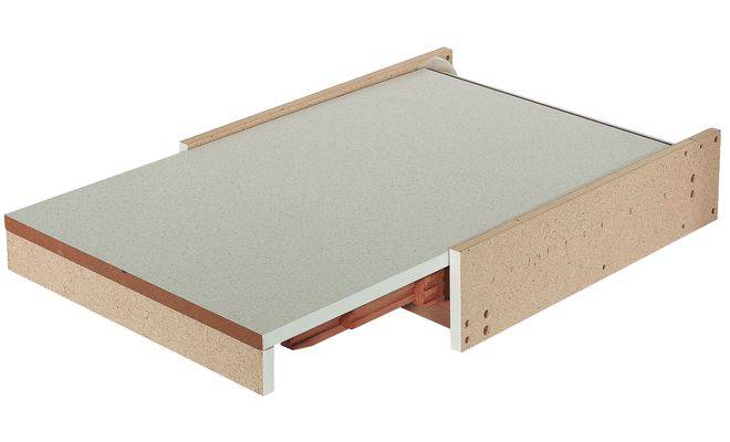Выдвижной стол Rapid, для установки в шкаф шириной от 562 мм. Грузоподъемность стола 100 кг. Стол изготовлен из дерева, поверхность стола изготовлена из меламина с пластиковым покрытием белого / серого цвета, телескопические направляющие цвета букового дерева.