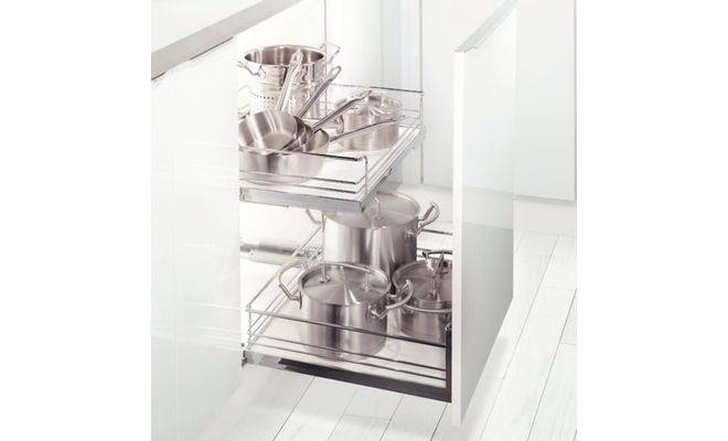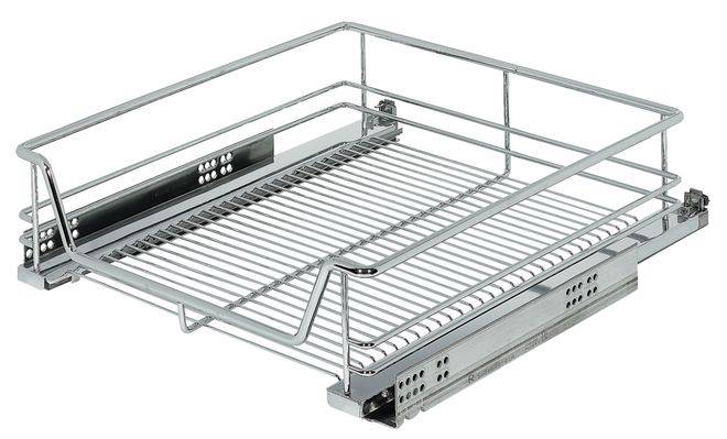 Внутренняя выдвижная проволочная полочка с нижним креплением ручки , для корпуса шириной 450 мм , оснащенная внутренним механизмом полного выдвижения Blum Tandem со встроенным амортизатором Blumotion . Выдвижной механизм оснащен направляющими на подшипниках качения и предназначен для монтажа за лицевыми панелями. Несущая способность 30 кг , глубина установки 505 мм , толщина боковой стенки 16 или 19 мм. Проволочная полка изготовлена из хромированной стали , направляющие - оцинкованная сталь. Размер полки : ширина 395 мм , глубина 500 мм , высота 127 мм.