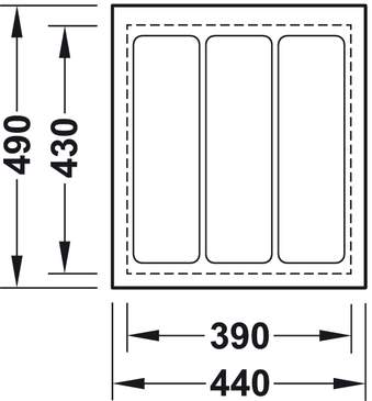 Вставка для столовых приборов, с широкой кромкой для раскроя на точный размер выдвижного ящика, материал: пластмасса, метод глубокой вытяжки, цвет: белый, в рубчик, толщина материала 2.5 мм, высота 57 мм, для номинальной длины 500 мм, глубина 410-480 мм, для ширины корпуса 500 мм, ширина 380-440 мм.