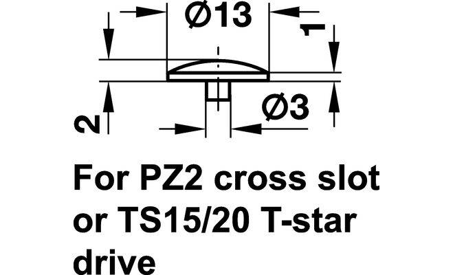 Заглушка к винту для ДСП с крестовым шлицем PZ2 или внутренней звездочки IS 15/20. Материал заглушки: дуб. Размеры заглушки: диаметр головки 13 мм, толщина головки 2 мм, диаметр ножки 3 мм.