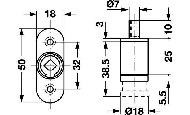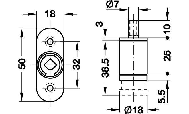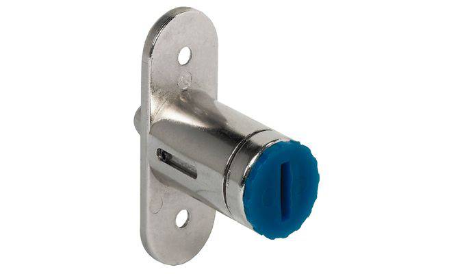 Замок для мебели зажимного типа. Производится компанией Hafele. Предназначен для установки в раздвижных дверях. Имеет серебристую глянцевую поверхность. Конструкция детали нажимная. Высота замка мебельного составляет 50 миллиметров, ширина – 18 мм. Диаметр круглой части также восемнадцать миллиметров. Используется для сердечников цилиндра. Выполнен с помощью цинкового литья. Поверхность детали никелированная. Монтируется привинчиванием. Имеет внутреннюю резьбу запорного штифта М5. Предназначен для систем с замком центрального типа.