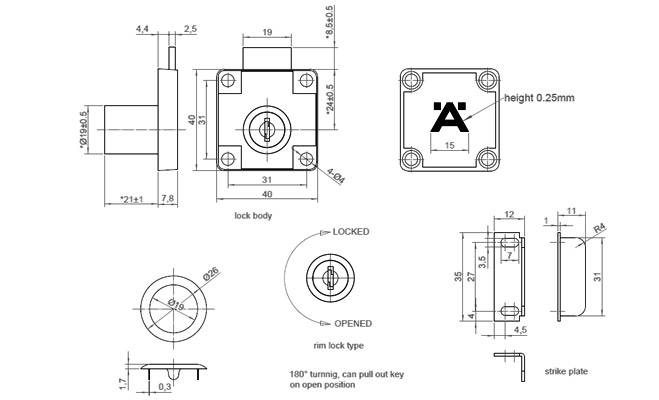 Комплект: замок с цилиндром, 2 складных ключи, лицевая розетка цилиндра замка и ответная часть замка. Материал: сталь Поверхность: никелированная. Техника запирания: цилиндр замка с 6 пластинчатыми штифтами. Комбинация: 120 различных комбинаций. Высота цилиндра замка: 21 мм. Диаметр цилиндра замка: 19 мм. Внешний диаметр розетки замка: 26 мм. Расстояние от центра цилиндра замка до крайней кромки замка со стороны ригеля: 24 мм. Монтаж путём привинчивания шурупами с потайной головкой диаметром 3 мм. Шурупы не входят в комплект, при выборе шурупов учитывайте толщину замка 8 мм и толщину двери.