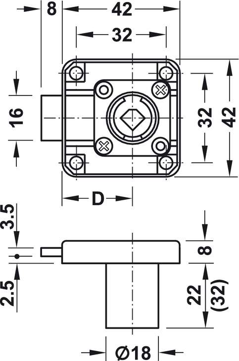Материал: цамак Поверхность: никелированная Размер до ручки D: 25 мм Длина корпуса цилиндра: 22 мм или 32 мм Монтаж: путем привинчивания Крепление: справа Длина корпуса цилиндра: 22 мм