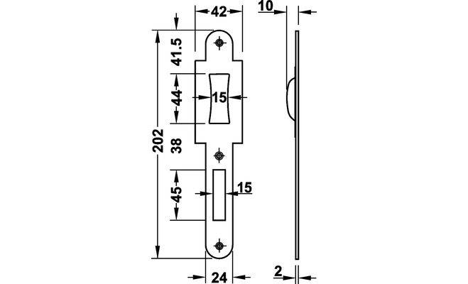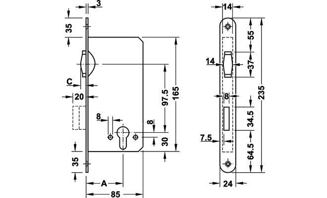 Технические характеристики Замок с роликовым язычком для профильного цилиндра, нержавеющая сталь 55 24 PC, с фиксирующим болтом