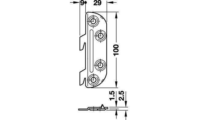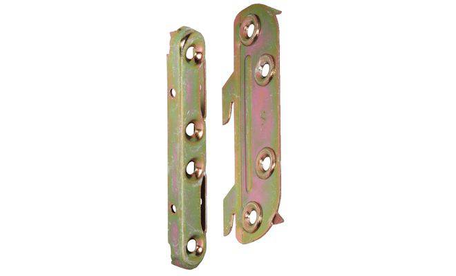 Угловой соединитель для кровати, с изогнутой крючковой частью изготовлен из желтой хромированной стали. Монтаж соединителя выполняется путем прикручивания шурупами. Объем поставки каждого комплекта: 4 запорных части (100х15х10 мм) 2 левые и 2 правые; 4 крючковых части (100х29х9х2, 5х1, 5 мм) 2 левые и 2 правые.