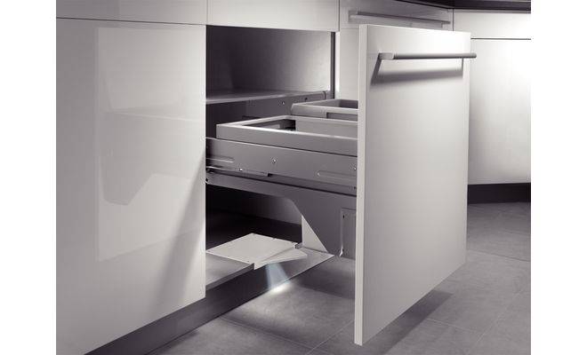 Електричний пристрій для автоматичного відкривання сміттєзбірників за лицевими панелями. Запуск пристрою відбувається завдяки датчику в зоні цоколя, вмонтоване світлодіодне пошукове освітлення, та можливе регулювання сили виштовхування. Розмір пристрою; 187х164 мм, напруга мережі 230 V, 50/60 Hz. Монтаж електричного пристрою виконується шляхом просвердлення отворів в нижній панелі шафи.