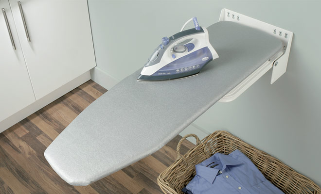 У розкладеному стані може повертатися на 180 градусів і розміщуватися вздовж стіни. Прасувальна дошка кріпиться до стіни і в закритому стані закривається боксом - чохлом.
