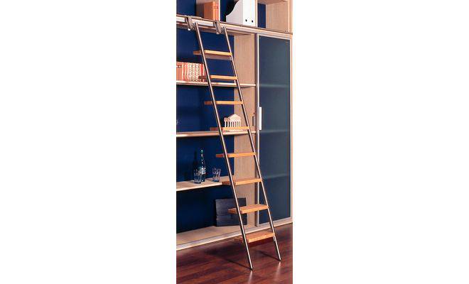 Навісна драбина для бібліотек, готелів та житлових приміщень. Балки драбини та кронштейни сходинок виготовлені з нержавіючої сталі з матовою поверхнею, сходинки виготовлені з шаруватої клеєної деревини берези та вкриті прозорим лаком. Монтаж виконується шляхом насаджування навісної дужки на навісну шину. Максимальне навантаження драбини до 150 кг, товщина сходинки 24 мм. Навісна драбина оснащена захистом від перекидання за рахунок навісної дужки, з невидимим кріпленням сходинок. Також драбина може приставлятись до полиці вертикально без навішування.
