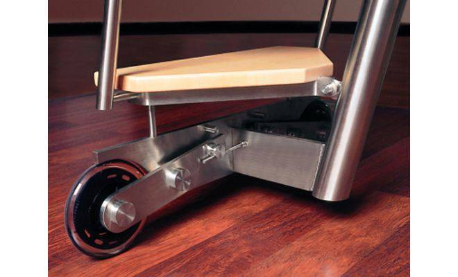 Навісна драбина без сходинок, для бібліотек, готелів та житлових приміщень. Балки драбини та кронштейни сходинок виготовлені з нержавіючої сталі з матовою поверхнею. Монтаж виконується шляхом насаджування на навісну шину. Максимальне навантаження драбини до 150 кг. Навісний елемент оснащений трьома ходовими роликами. При навантаженні драбина гальмується зверху і знизу. Розсувна драбина оснащена захистом від ненавмисного відчеплення.