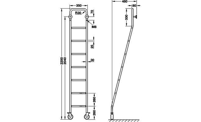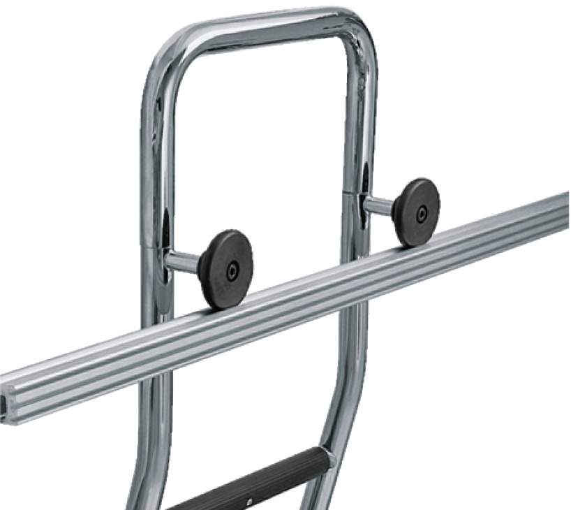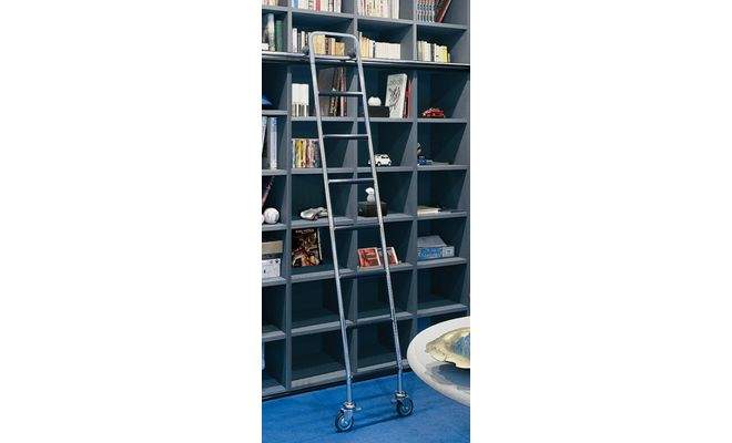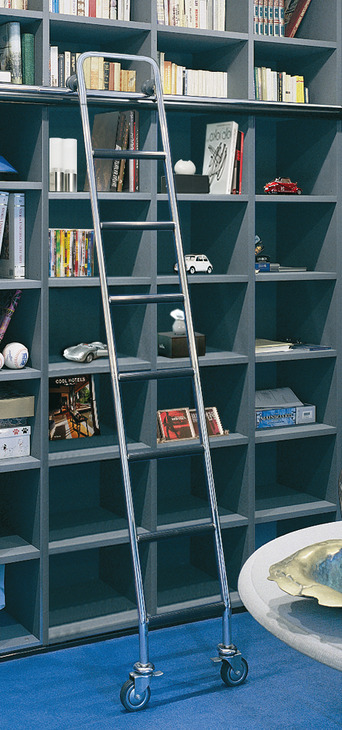 Розсувна драбина для бібліотек, готелів та житлових приміщень. Дана версія драбини оснащена роликами на шарикопідшипниках з гумовим покриттям, з нековзкими балками. Драбина виготовлена з хромованої сталі з полірованою поверхнею, балки виготовлені з хромованої сталі з пластиковим покриттям чорного кольору, ролики та кришка виготовлені з пластмаси.