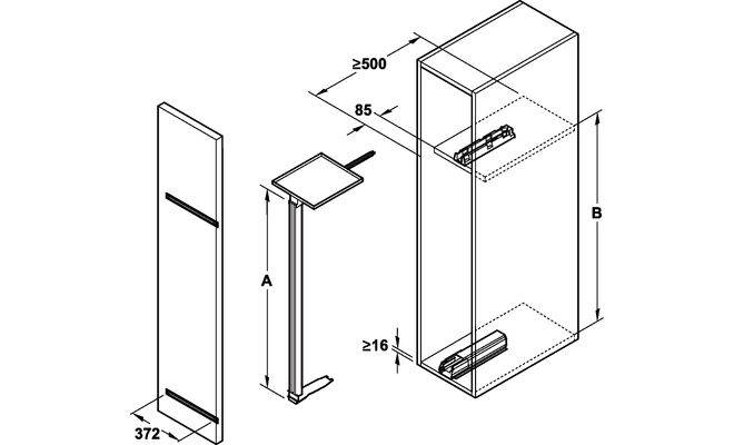 Фронтальний висувний механізм колонки з системою повного висуву з амортизатором засуву і висуву, призначений для внутрішньої висоти корпусу 1100-1200 мм, для ширини корпусу 450 мм. Полиці з боковим підвищенням і нековзким покриттям, верхня полиця закриває направляючу, подальші полиці можуть плавно переставлятись по висоті. Несуча здатність 100 кг (вага продуктів), глибина корпусу 500 мм, товщна бокової стінки 16 або 19 мм. Комплект виготовлений зі сталі з пластиковим покриттям кольору білий алюміній, висувний механізм - сталь кольору - ДСП білого кольору.