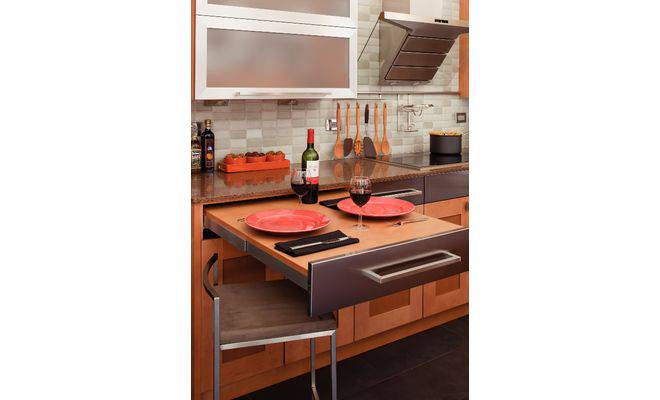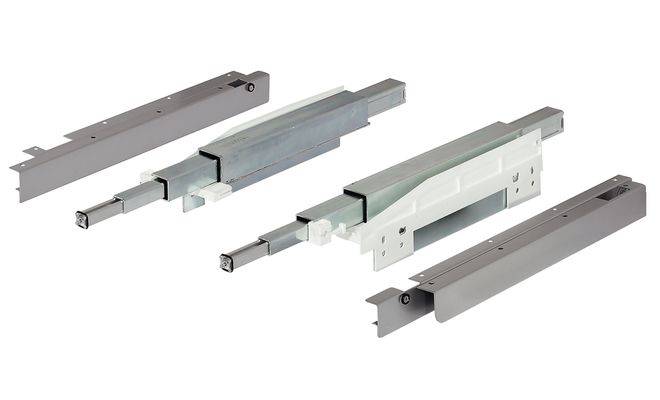 Фурнітура для висувного стола без робочої плити, з автоматичним опусканням лицевої панелі до рівня додаткової робочої плити, з боковим облицюванням фурнітури. Фурнітура для стола виготовлена з оцинкованої сталі бо сталі з пластиковим покриттям кольору білий алюміній. Стіл призначений для корпусу шириною 450-900 мм, глибини корпусу від 400 мм, довжина висуву 610 мм, несуча здатність 30 кг.