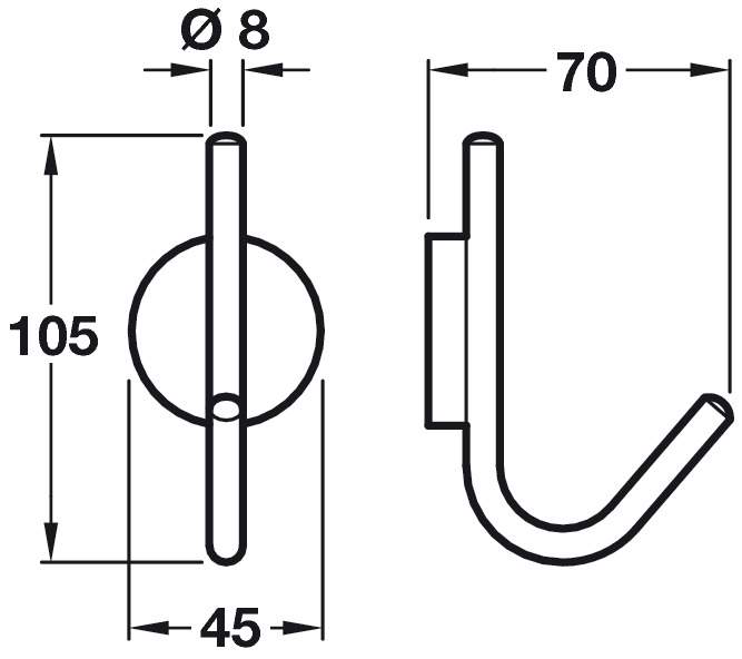 Гардеробний гачок для пальто, з кріпленням у вигляді кола. Гачок виготовлений з нержавіючої сталі, класу якості 1.4301, з матовою поверхнею. Спосіб кріплення: прихований, шляхом прикручування шурупами до вертикальної поверхні. Розміри гачка, глибина/висота/діаметр - 70/105/8 мм, відстань між отворами: 17 мм, діаметр крілення: 45 мм.