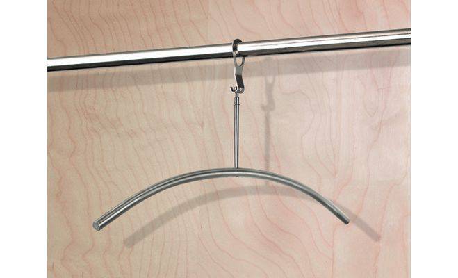 Гачок для гардеробного вішака, використовується для підвісного кронштейну діаметром до 35 мм. Застосовується в якості базуючої деталі для гардеробних вішаків з гостиничним штифтом. Гачок виготовлений з хромованої сталі.