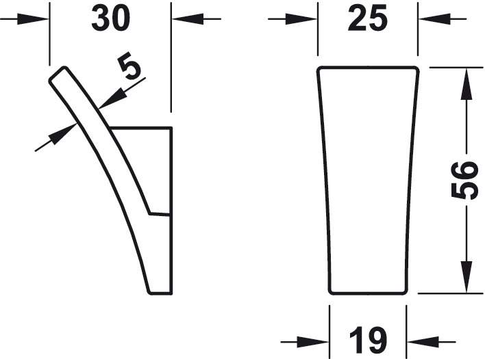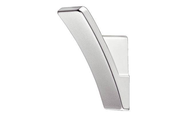 Гардеробний гачок, виготовлений з цинкового сплаву, хромований з матовою поверхнею. Спосіб кріплення: шляхом прикручування гвинтами до вертикальної поверхні. Розміри гачка, ширина/глибина/висота - 25/30/ 56 мм, відстань між отворами 10 мм.