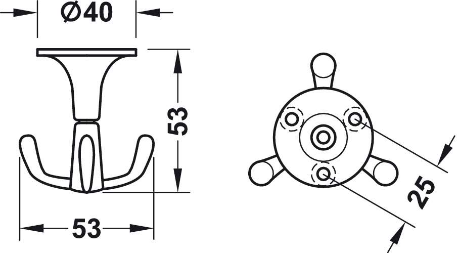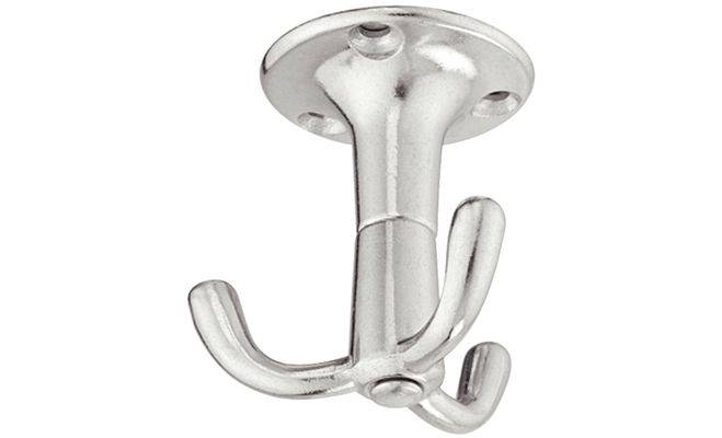 Гардеробний стельовий гачок-трійник, виготовлений з алюмінію з полірованою поверхнею. Спосіб кріплення: шляхом прикручування шурупами до стелі. Розміри гачка, ширина/глибина/висота- 53/53/55мм.