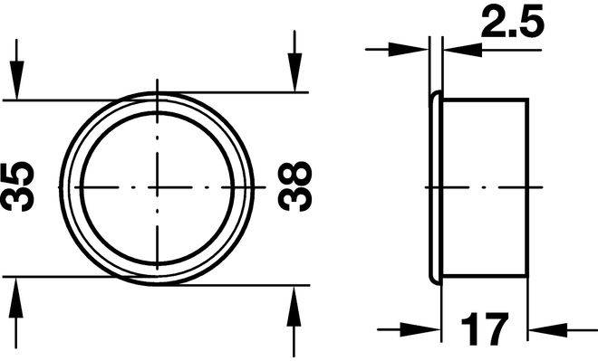 Кільце для вентиляційного отвору, з захисною кромкою. Вентиляційне кільце виготовлене з пластмаси білого кольору. Зовнішній діаметр кільця 38 мм, внутрішній діаметр 35 мм, глибина 17 мм, товщина кромки 2,5 мм. Монтаж вентиляційного кільця виконується шляхом врізання.