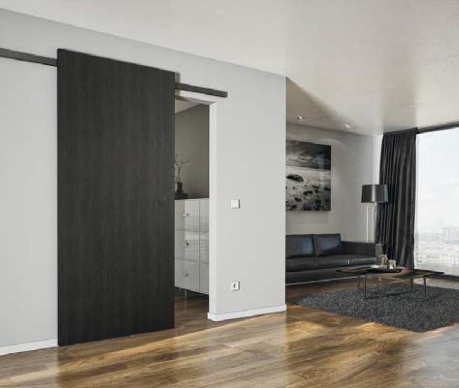 Опис Комплект фурнінури Slido D-Li41 50X для 1 дверного полотна з 2- стороннім доводчиком і чорною шиною 2 м 94042270