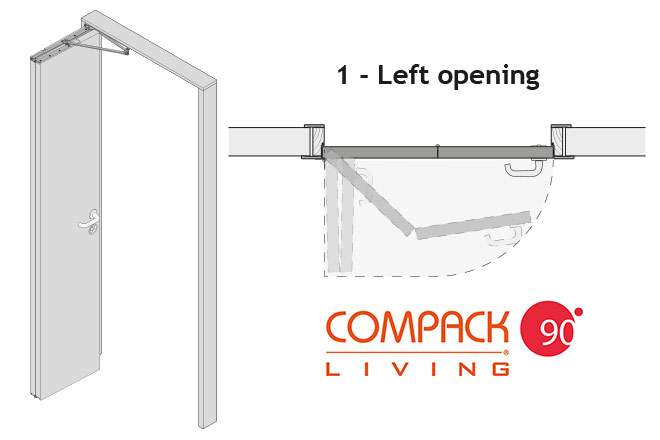 Спосіб відкриття: Поворотно-зсувні двері Compack легко складаються, а потім або здійснюють обертальний рух і займають місце уздовж стіни, або фіксуються під кутом 90 ° до неї