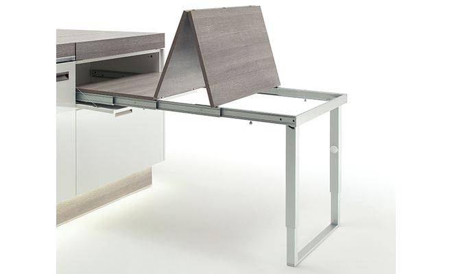 Для кухні, житлового приміщення або офісу. Висувний стіл може бути встановлений у вигляді шухляди. Несуча здатність: 60 кг. Матеріал: висувні направляючі: алюміній; ніжки столу: сталь. Колір: висувні направляючі сріблястий. Ніжки столу: білий алюміній.