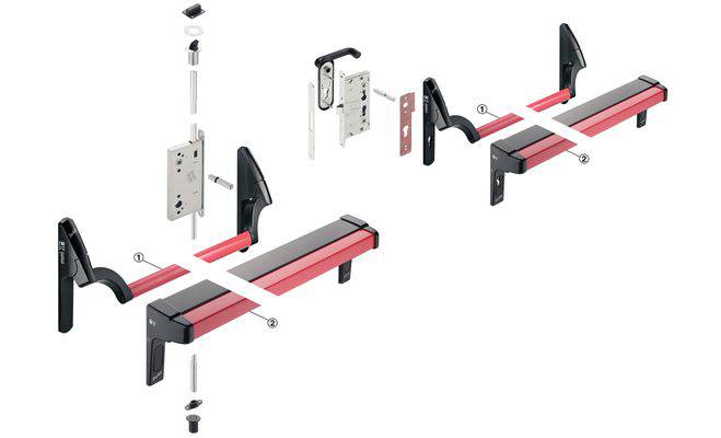 Комплект фурнітури PED 100 для 2-х дверних полотен з натискною штангою червоний 91131077