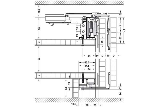 Опис Комплект фурнітури Slido F-Line43 70A для 2-х дверних полотен 19 мм 40235000