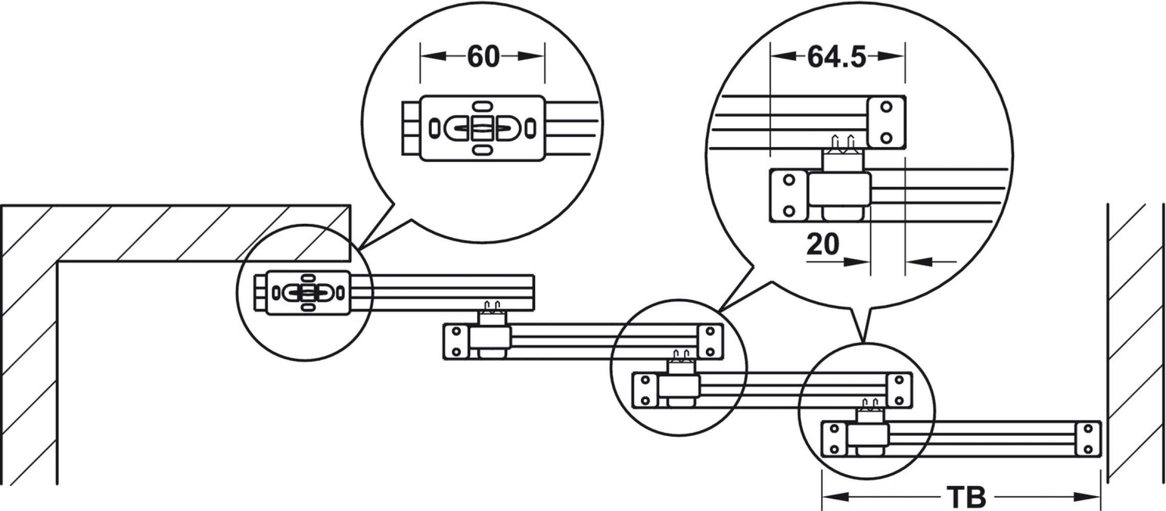 Комплект для зв'язки розсувних дверей в групі 940.44.001. Для розсувних дверей, які відкриваються в одну сторону по черзі. Підходить для всіх систем Classic 40-P - 120-P і 40-O - 120-O. Для ширини дверей: від 710 мм. Для групи: 2 - 4 двері. Для групи з 2 дверей замовляйте 1 комплект. Для групи з 3 дверей, будь ласка, замовте 2 комплекти. Для групи з 4 дверей, будь ласка, замовте 3 комплекти. Один комплект складається з: направляючої з кутом - 1 штука; дверний стопор - 2 штуки.