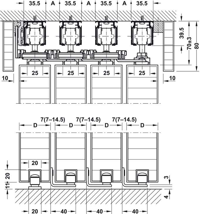 SLIDO TELESCOPIC SYNCHRO 100-A – система механізмів з одночасним синхронним рухом від двох до чотирьох дерев’яних полотен в одну сторону. Можливість монтажу до стелі надає системі надзвичайну легкість.