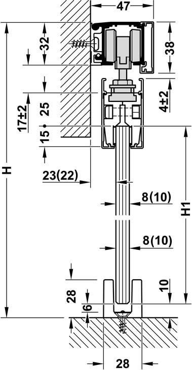 Регулювання висоти: -4 – 4 мм, ±2 (залежно від ситуації кріплення, див. малюнки) Область застосування для одно- та двостулкових розсувних дверей