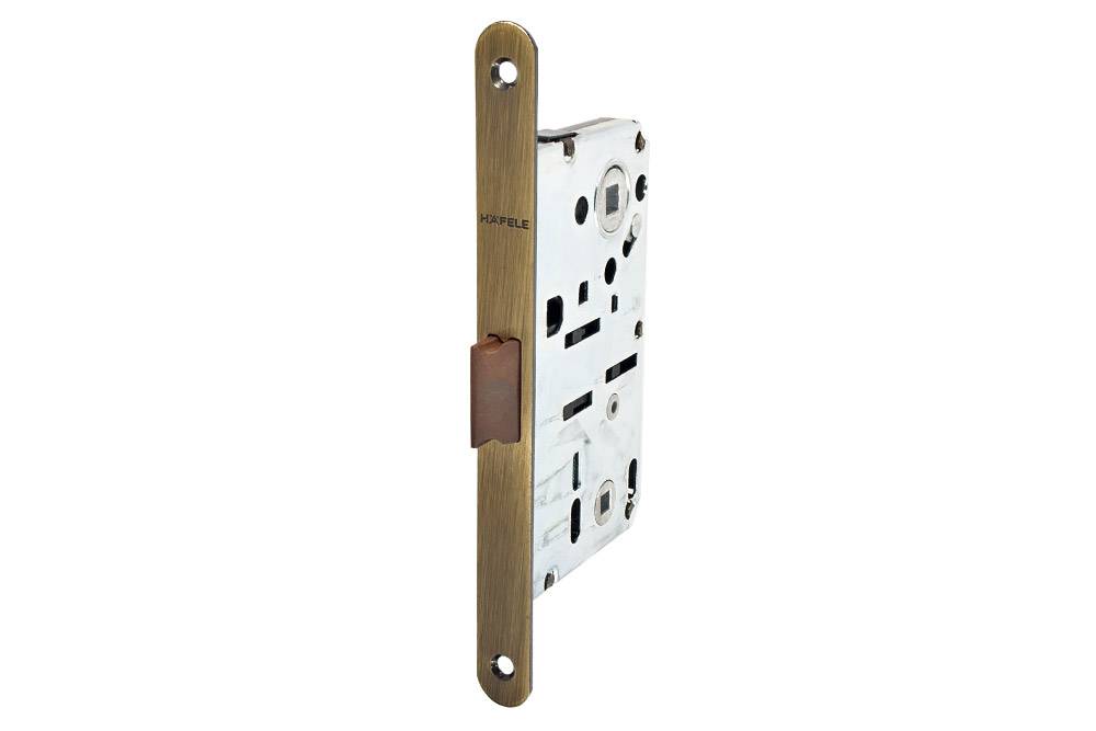 Врізний замок для дверей туалету. Врізні, для дверей з фальцем і без. Універсальні: правий і лівий. Матеріал: Лицьова планка: сталь, колір: стара бронза. Корпус: сталь. Пластиковий ригель забезпечує безшумне закривання дверей, без металевого дзвону. Розмір для чотиригранного штифта дверних ручок: 8 х 6 мм. Ширина лицьової панелі врізного замку: 18 мм. Висота торцевої планки врізного замку: 196 мм. Глибина вставки замку: 75 мм. Ригель замка: для закриття та відкриття замку потрібен один оборот. Монтаж методом занурення.