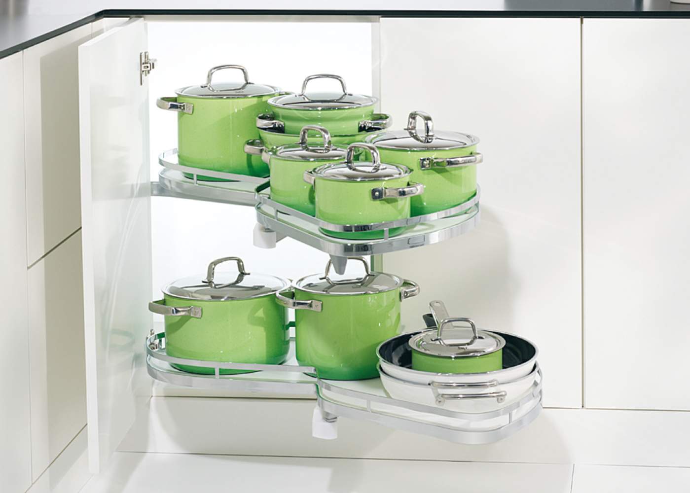 Повний комплект Le Mans ІІ Arena Style для висувних кутових шаф, з демпфером, лівоповоротний, з можливістю повного висування корзин, кожна корзина рухається самостійно, з протиковзким покриттям, кількість корзин: 2 шт., матеріал: сталь, колір: білий, для внутрішньої глибини шафи 450 мм, для внутрішньої висоти шафи 600–750 мм, товщина бокових панелей 16 або 19 мм, максимальне навантаження 25 кг/полиця.