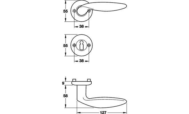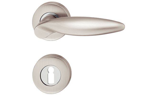 Комплект важільних ручок, виготовлених з латуні. Є в наявності з хромованою матовою поверхнею та нікельованою матовою, хромованою полірованою. Кріплення одностороннє, за допомогою 4 гвинтів 5 х 45 мм. Застосовуються для дерев’яних дверей під ключ з борідкою. Чудово підійдуть до дизайну сучасних інтер’єрів та слугуватимуть довго та надійно завдяки якості та надійності використаних матеріалів.