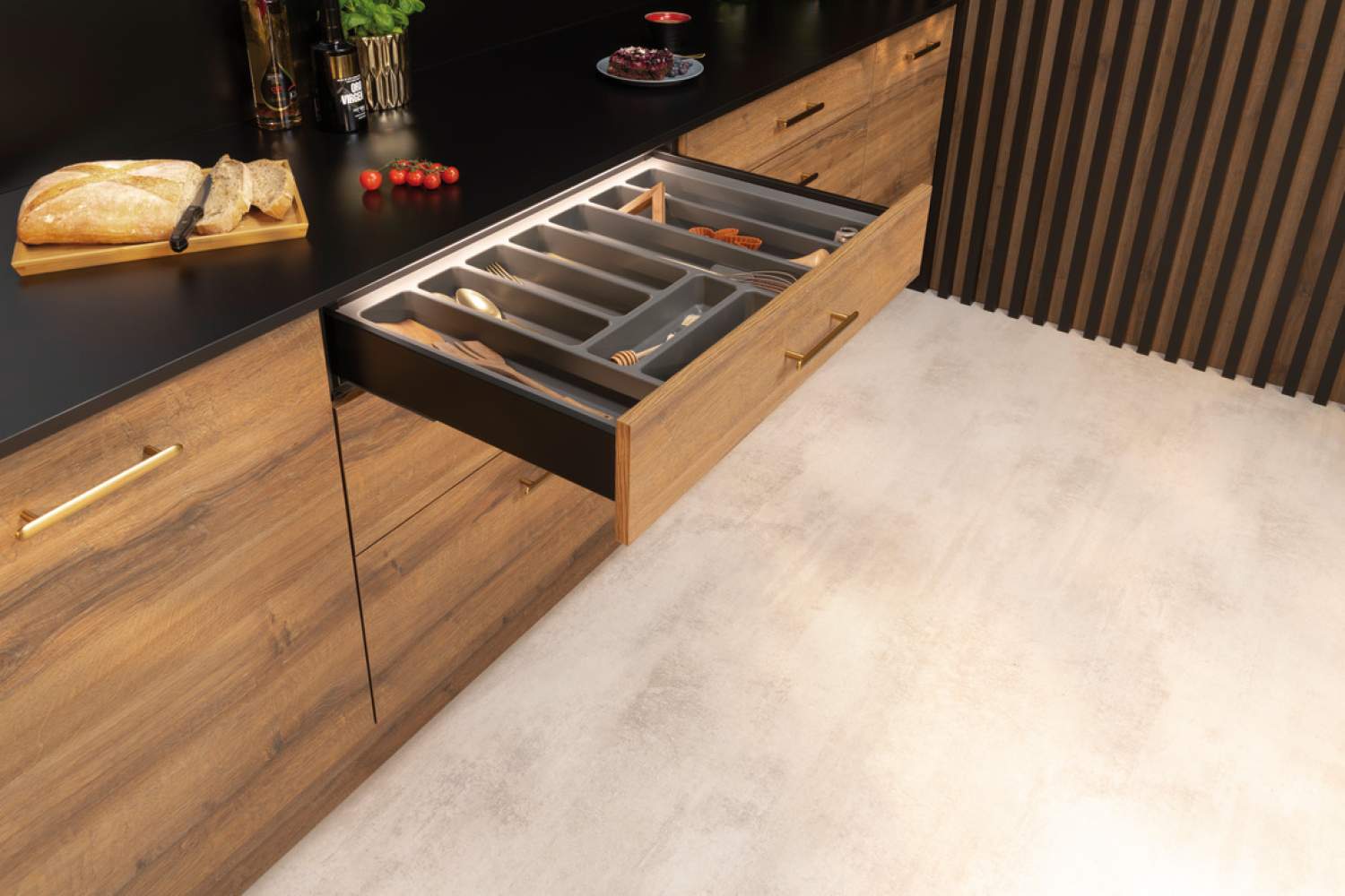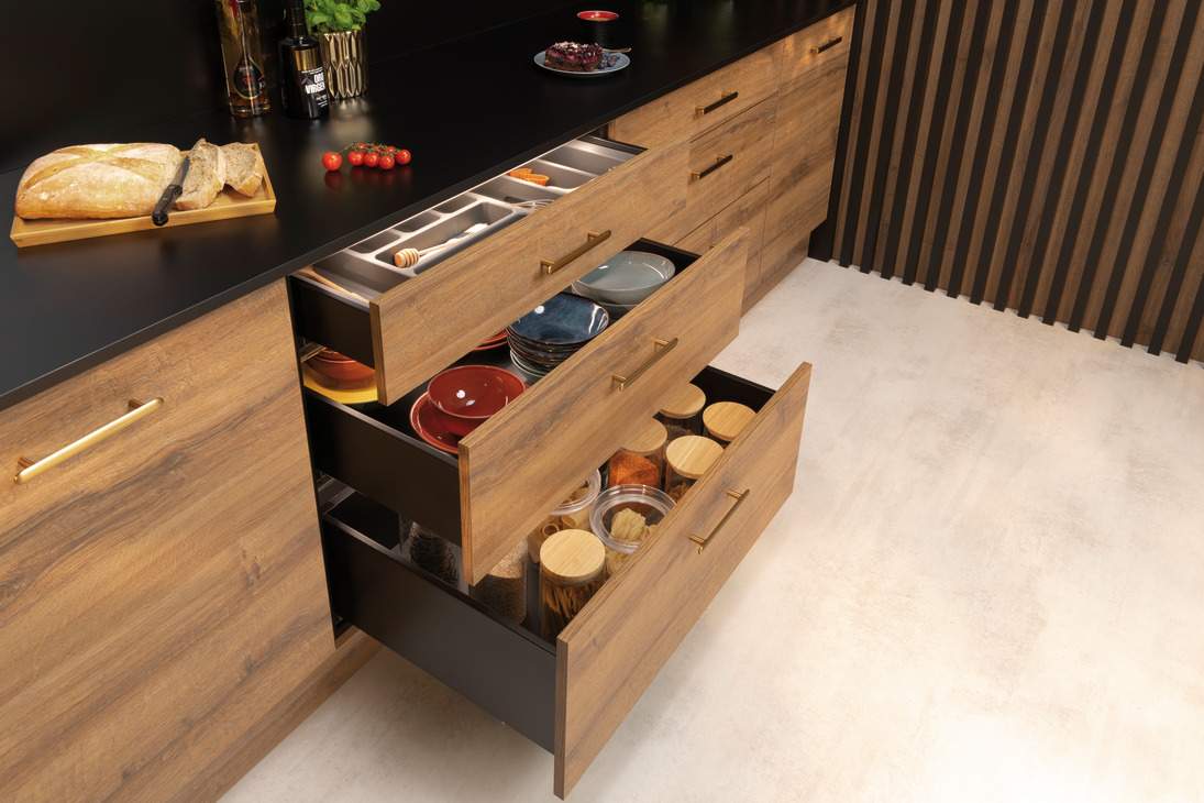 Висувні шухляди Matrix S Slim збільшують корисну ємність меблів. Ідеально прямі та тонкі царги (13 мм) збільшують місткість шухляд, зберігаючи при цьому стабільність конструкції та здатність витримувати навантаження до 35 кг. Три варіанти висоти царг роблять систему гнучкою та універсальною – від кухні до гардеробу. Стримана біло-чорна кольорова гама дозволяє шухлядам гармонійно вписатися в будь-який інтер'єр, незалежно від його дизайну.