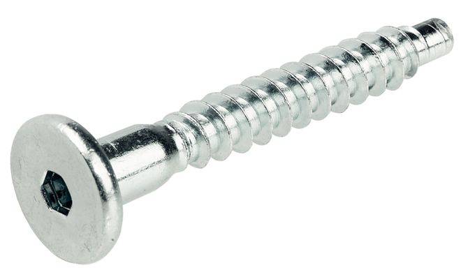 Одинарна стяжка Confirmat для отворів діаметром 5 мм,з циліндричною голівкою, виготовлена зі сталі з поверхнею чорного кольору. Параметри стяжки: діаметр хвостової частини-7мм; діаметр різьби-7мм; довжина-50мм; привід -внутрішній шестигранник SW4.