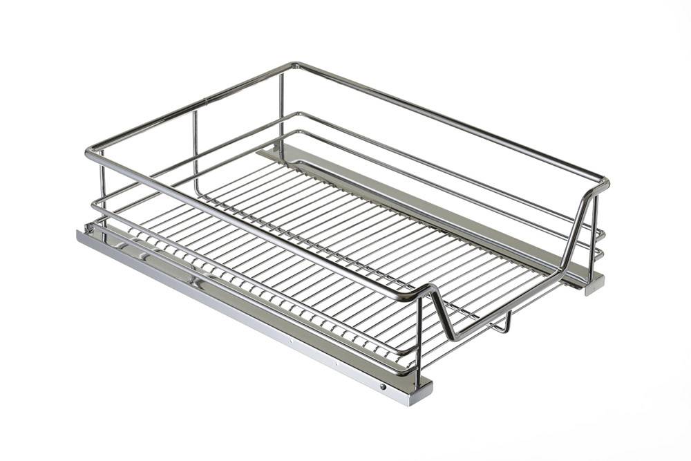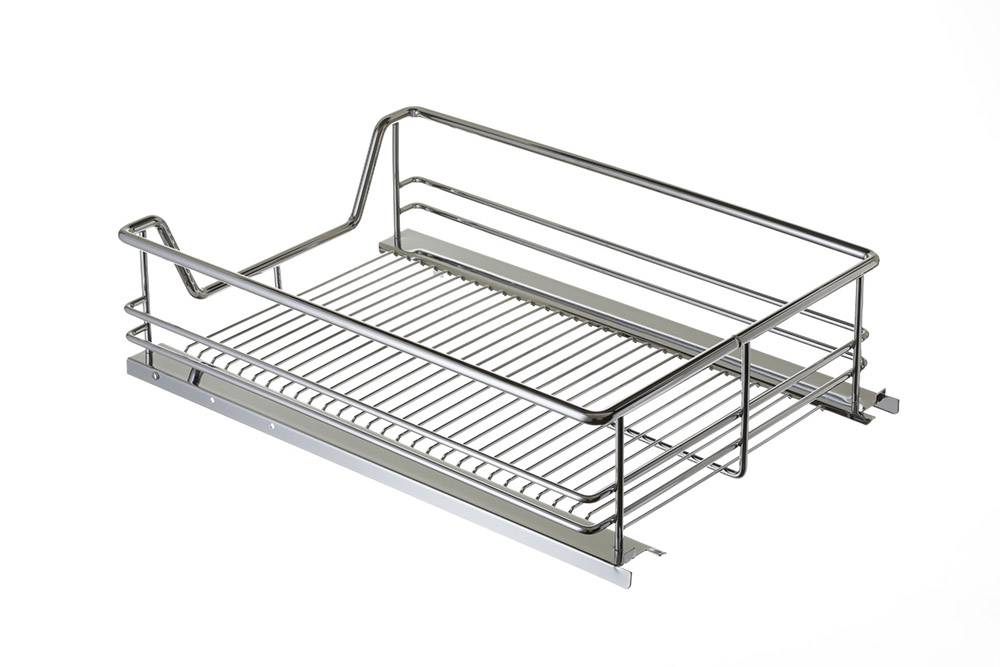 Висувна корзина з направляючими на підшипниках кочення з механізмом повного висуву та самозакриванням, з низькою передньою решіткою для легкого доступу, для внутрішньої ширини корпусу шафи 368 мм. Корзина виготовлена з хромованої сталі, направляючі виготовлені з оцинкованої сталі. Несуча здатність висувного механізму 30 кг, глибина встановлення 505 мм, розмір корзини: ширина 345 мм, глибина 500 мм, висота 127 мм.