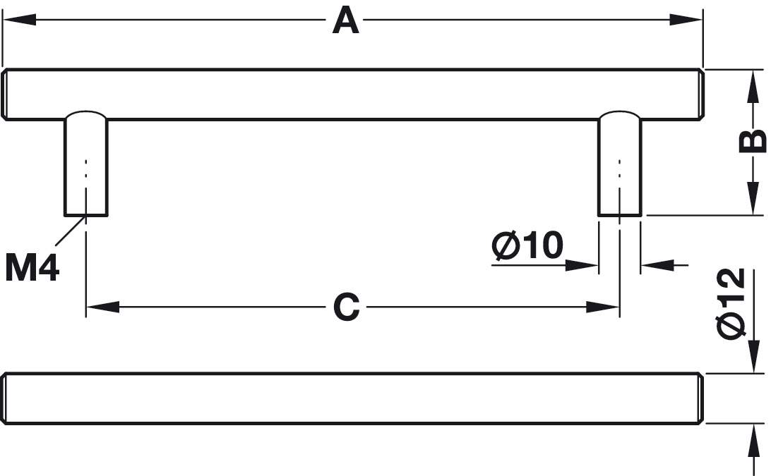 Технічні характеристики Меблева ручка релінг сталева хромований полірований A: 488 мм B: 35 мм C: 448 мм 15500812