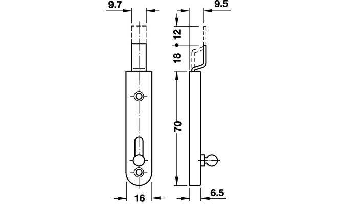 Технічні характеристики Меблевий засув 70х9,5 з вигином, 25102121