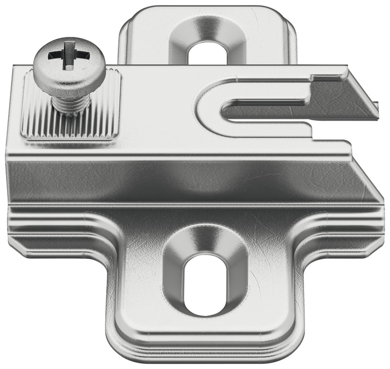 Монтажна хрестоподібна планка Häfele Metalla 310 A, з технологією надівання, регулювання по висоті ±2 мм, дистанція 2 мм. Призначена для встановлення накладних, середніх та внутрішніх завіс Häfele Metalla 310 A. Виготовлена зі сталі з нікельованим покриттям. Відстань між отворами для гвинтів 32 мм, відстань до краю 37 мм. Монтаж здійснюється шурупами для ДСП.