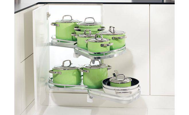 Набір висувних полиць LeMans II Style, з попередньо вмонтованою фурнітурою, лівоповоротний, з протиковзким покриттям, кількість полиць : 2 шт., матеріал: дно: ДСП, білого кольору/рама: сталь, хромована, для дверцят шириною 600 мм, кут відкривання дверцят мін. 85°, максимальне навантаження 25 кг/на полицю.