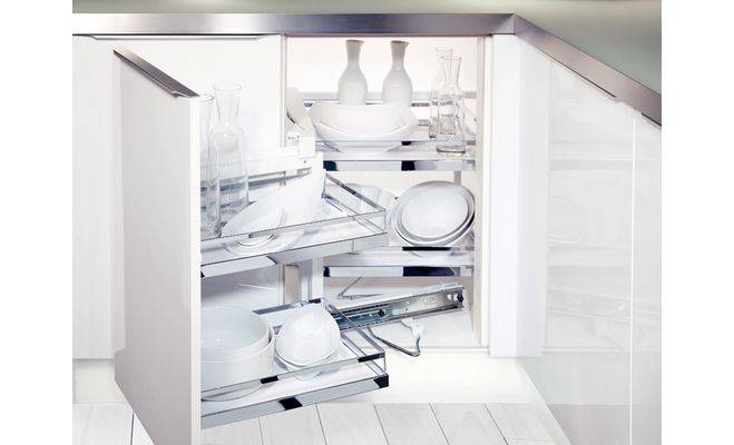 Комплект навісних полиць Arena Style, для кутової шафи Magic Corner, з протиковзким покриттям, матеріал: рама: сталь, хромована/полиця: ДСП, білого кольору, в комплект входить: 2 полиці розміром 295x470x75 мм і 2 полиці розміром 390x470x75 мм.