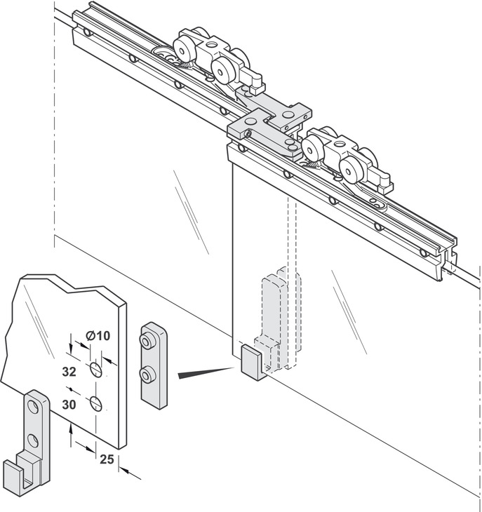 Тримачі для скла, додатковий набір Для фурнітури розсувних дверей Häfele Slido D-Line11 50L / 80L / 120L, 1 набір. Для товщини скла 8 і 10 мм. Сфера застосування: Для розсувних дверей від 2 до 4 дверних полотен.