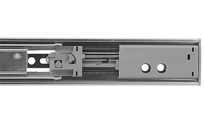 Кулькова направляюча для шухляд оснащена механізмом часткового висуву. Виготовлена зі сталі з оцинкованою поверхньою та має здатність навантаження до 45 кг з механізмом самозасувов і амортизатором Smuso.
