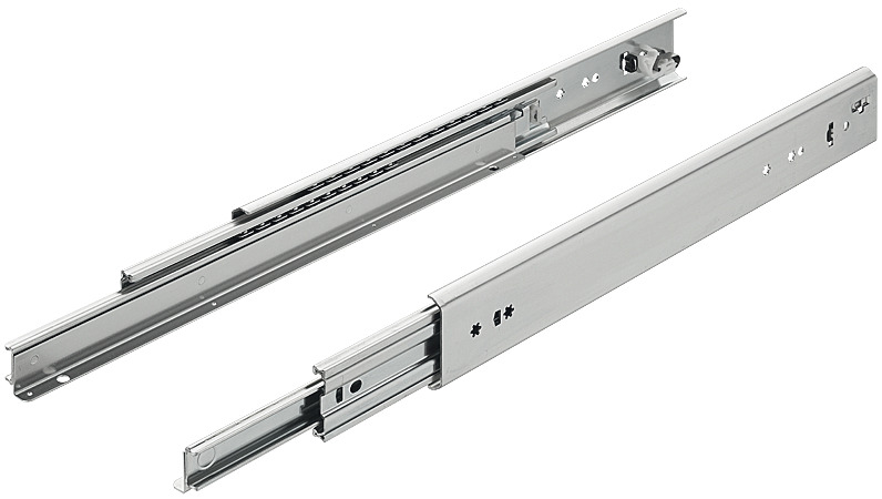 Шариковая направляющая выдвижных ящиков с механизмом полного выдвижения изготовлена из стали с оцинкованной поверхностью.Используется для ящиков с большой нагрузкой, оснащена механизмом фиксации в закрытом положении.