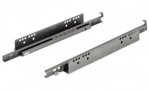 Фрезерування ящиків не потрібне при монтуванні кулькової направляючої. ЇЇ можна вкласти у меблі з фанери, плити ДСП, МДФ або дерева, завтовшки від 16 до 19 мм. Монтується нижнім кріпленням, пластиковими фіксаторами. Кулькова направляюча має доводчик. Її можна регулювати в межах 3 мм, з допомогою тих же пластикових фіксаторів.