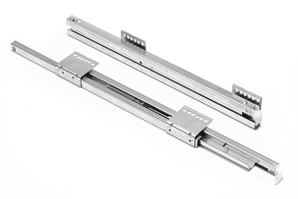 Направляюча для системи висувних ящиків MOOVIT довжиною від 270 до 650 мм. Виготовлена зі сталі з оцинкованою поверхнею. Витримує невеликі навантаження до 30 кг. Динамічне балансування навантаження. Кріпиться за допомогою пригвинчування або запресовування. Має властивість регулювання висоти та бокового регулювання зверху. Існує дев'ять варіантів товару, подібних за кольором та навантаженням.
