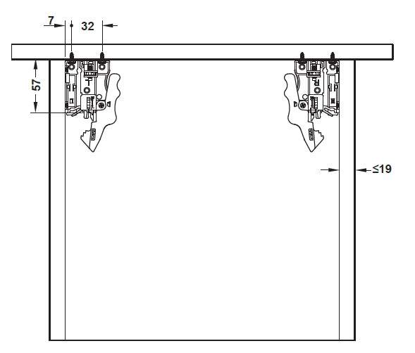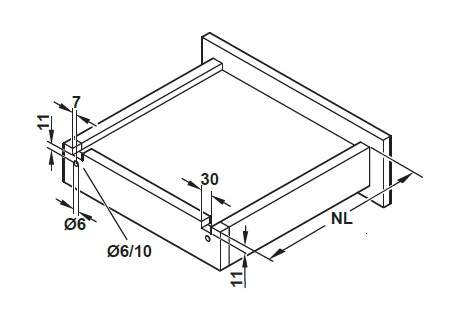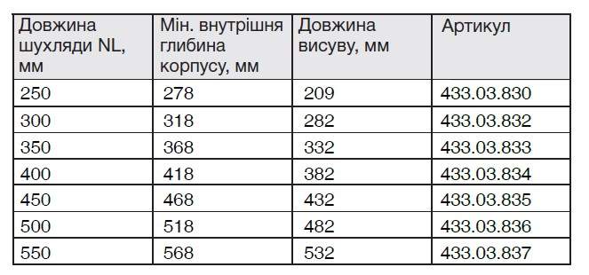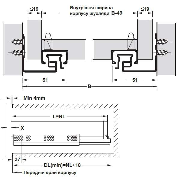 - Розміри: Макс. зовнішня ширина шухляди = внутрішня ширина корпусу – 49мм + 2 х товщина боковини шухляди Т=≤19мм;
